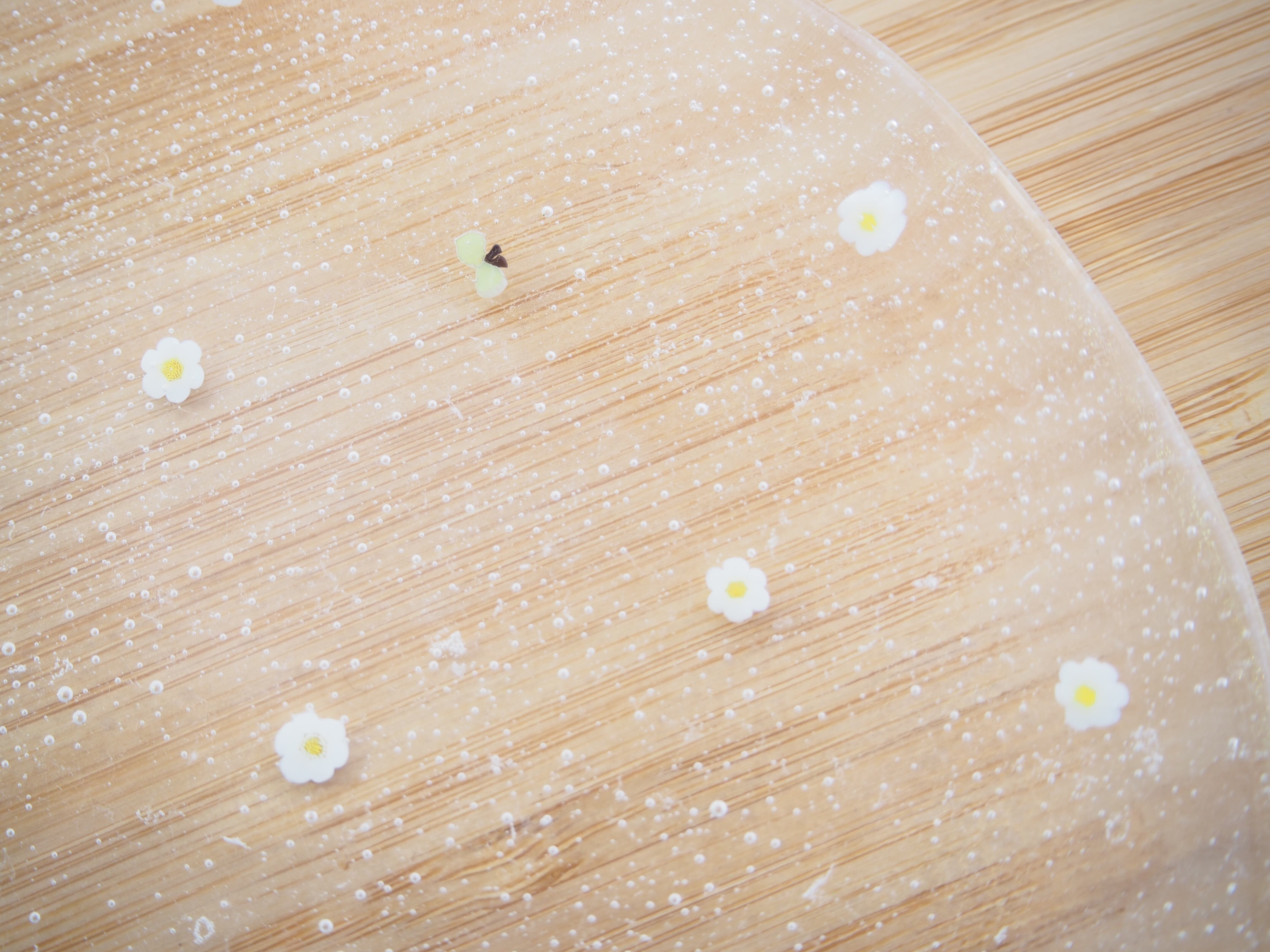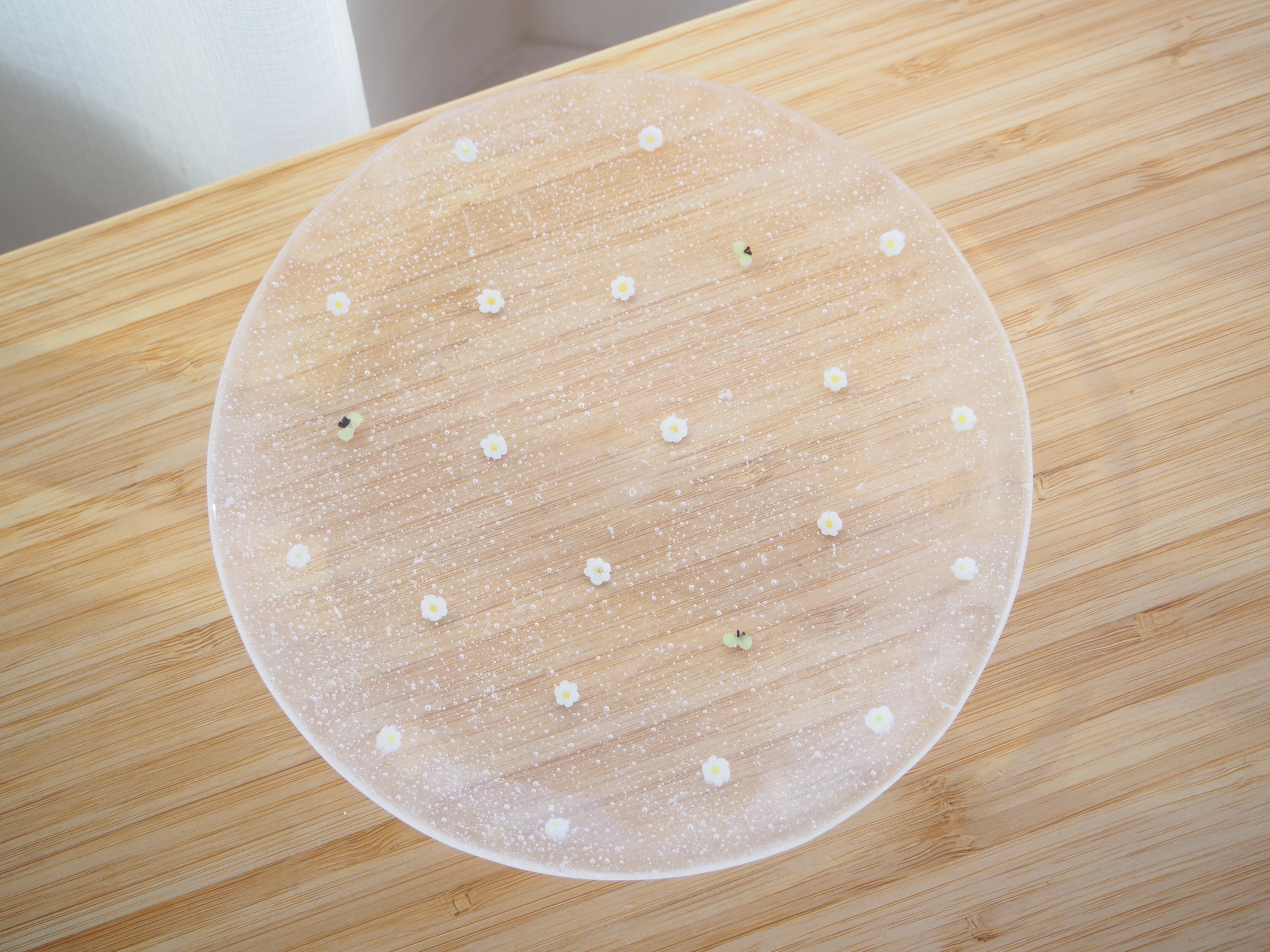 ソーダ水のようにシュワシュワした感じの小さな気泡とその中に浮かぶ花と蝶々のデザインは、食卓を一気に華やかに演出してくれます。サイズは約φ16cmとなっており、フルーツやおやつをのせるのに最適です。