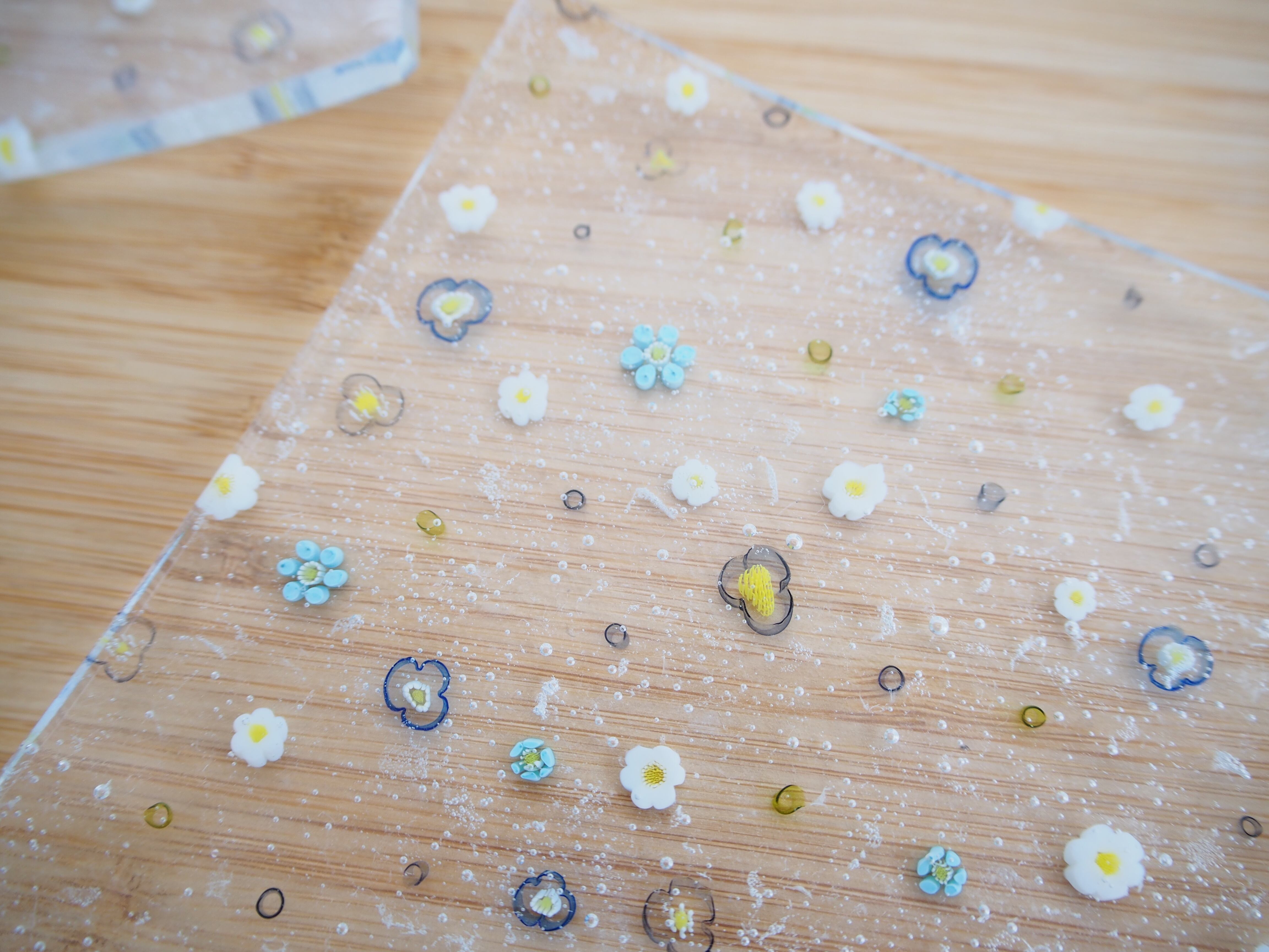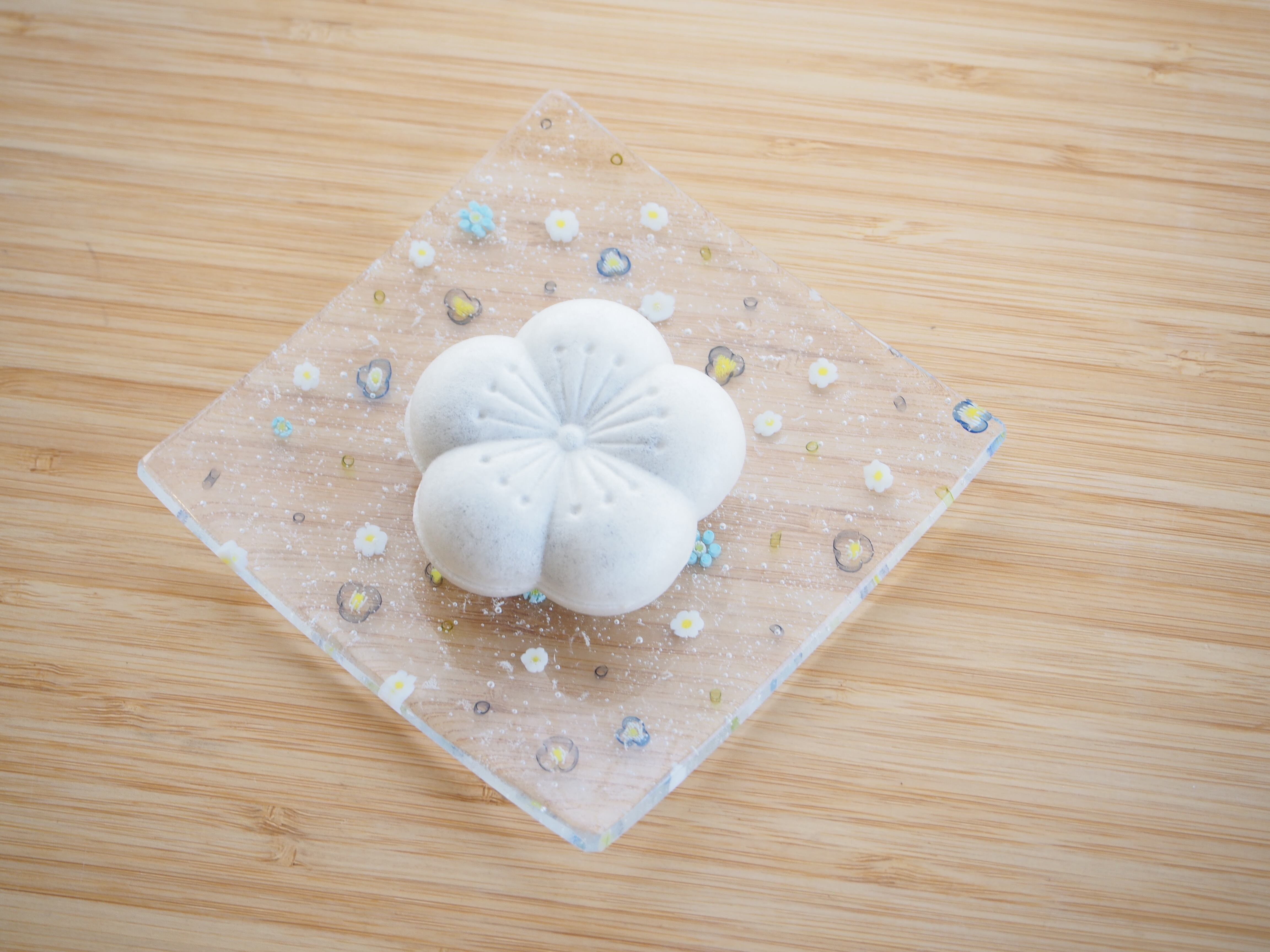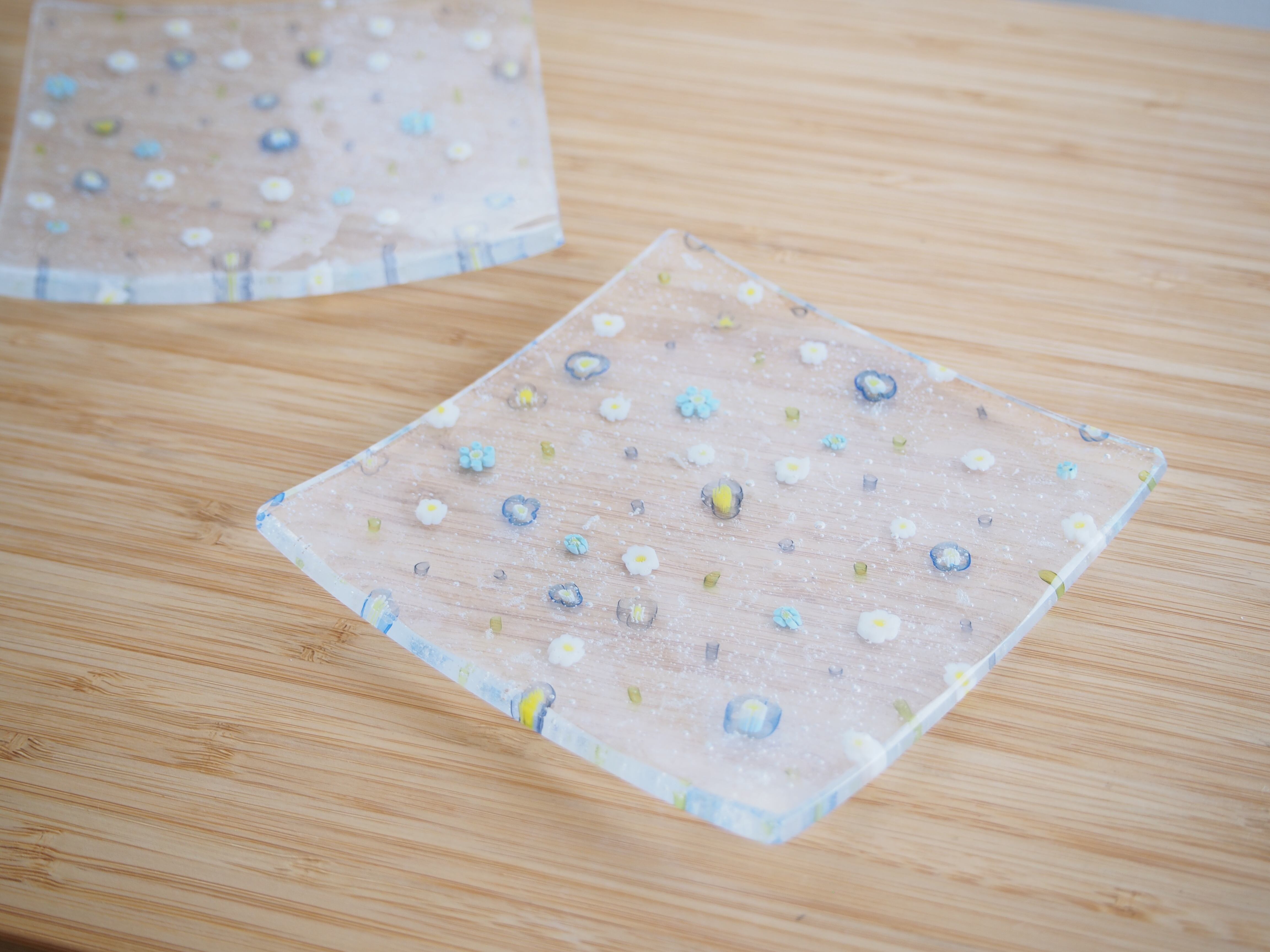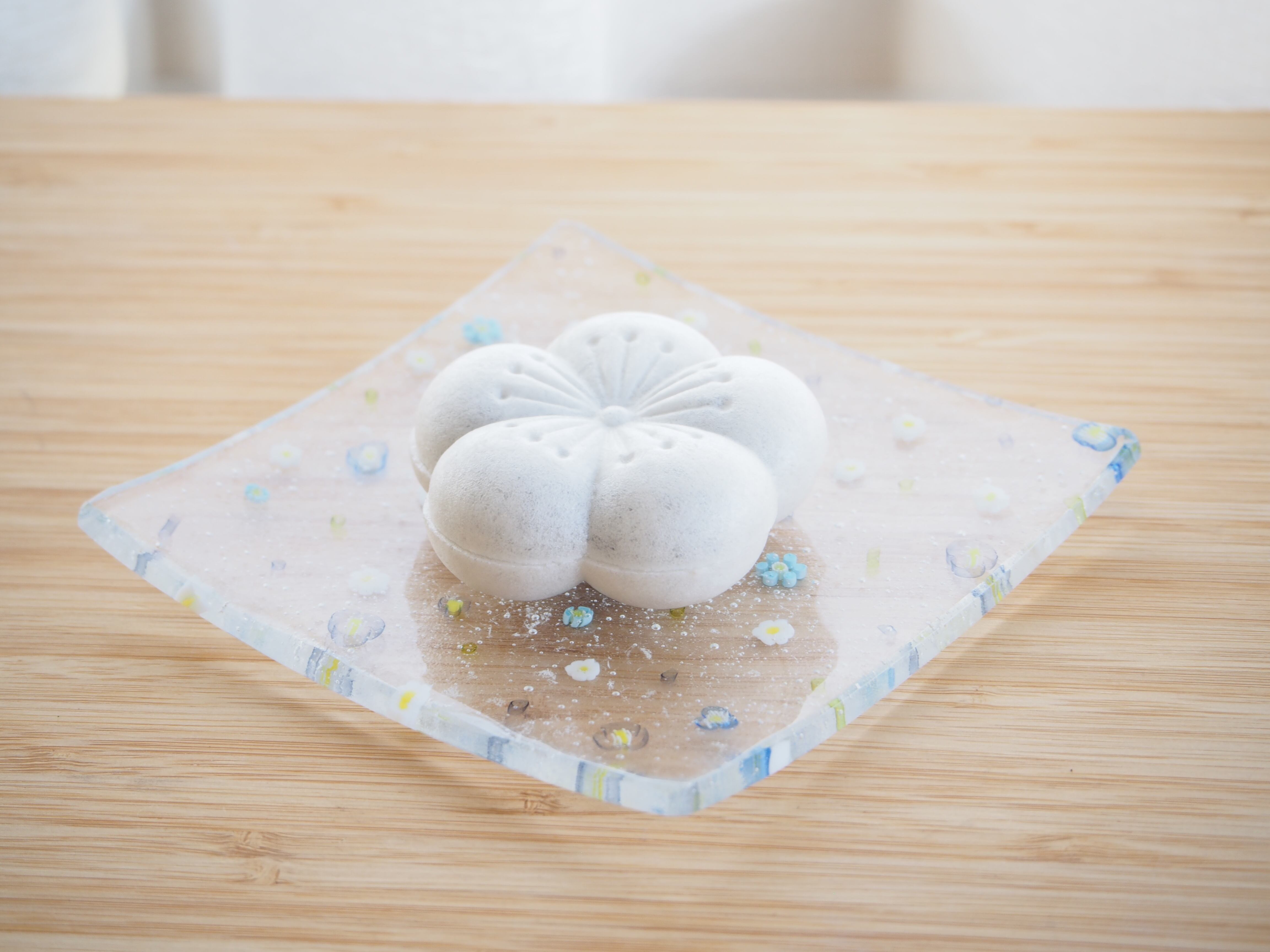 ソーダ水のようにシュワシュワした感じの小さな気泡とその中に浮かぶ花のデザインは、食卓を一気に華やかに演出してくれます。サイズは約11cm×11cmとなっており、チーズなどのおつまみや小さなお菓子などをのせるのにちょうど良いサイズです。