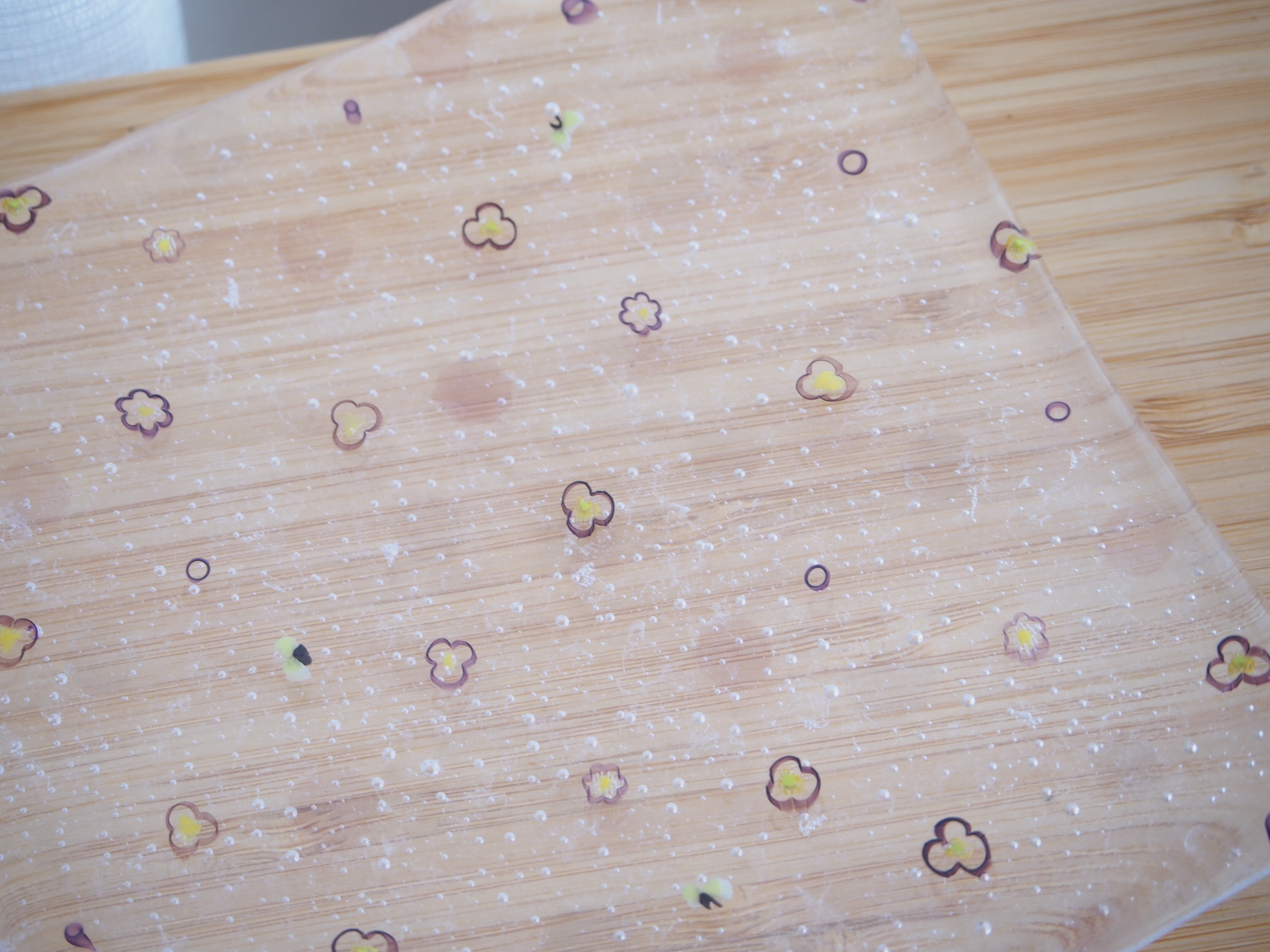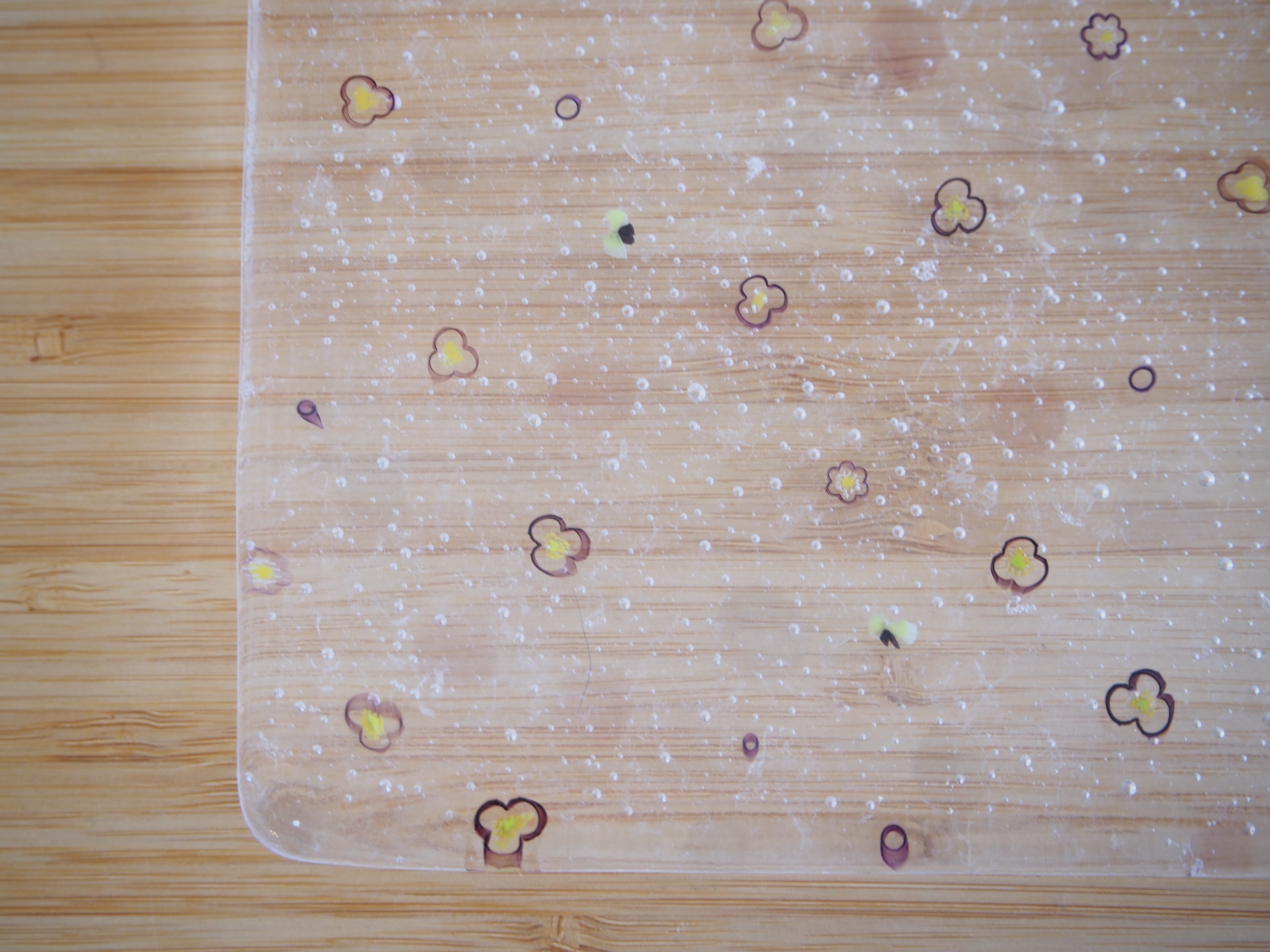 ソーダ水のようにシュワシュワした感じの小さな気泡とその中に浮かぶ花のデザインは、食卓を一気に華やかに演出してくれます。チーズなどのおつまみや和菓子・洋菓子などをのせるのにちょうど良いサイズです。
