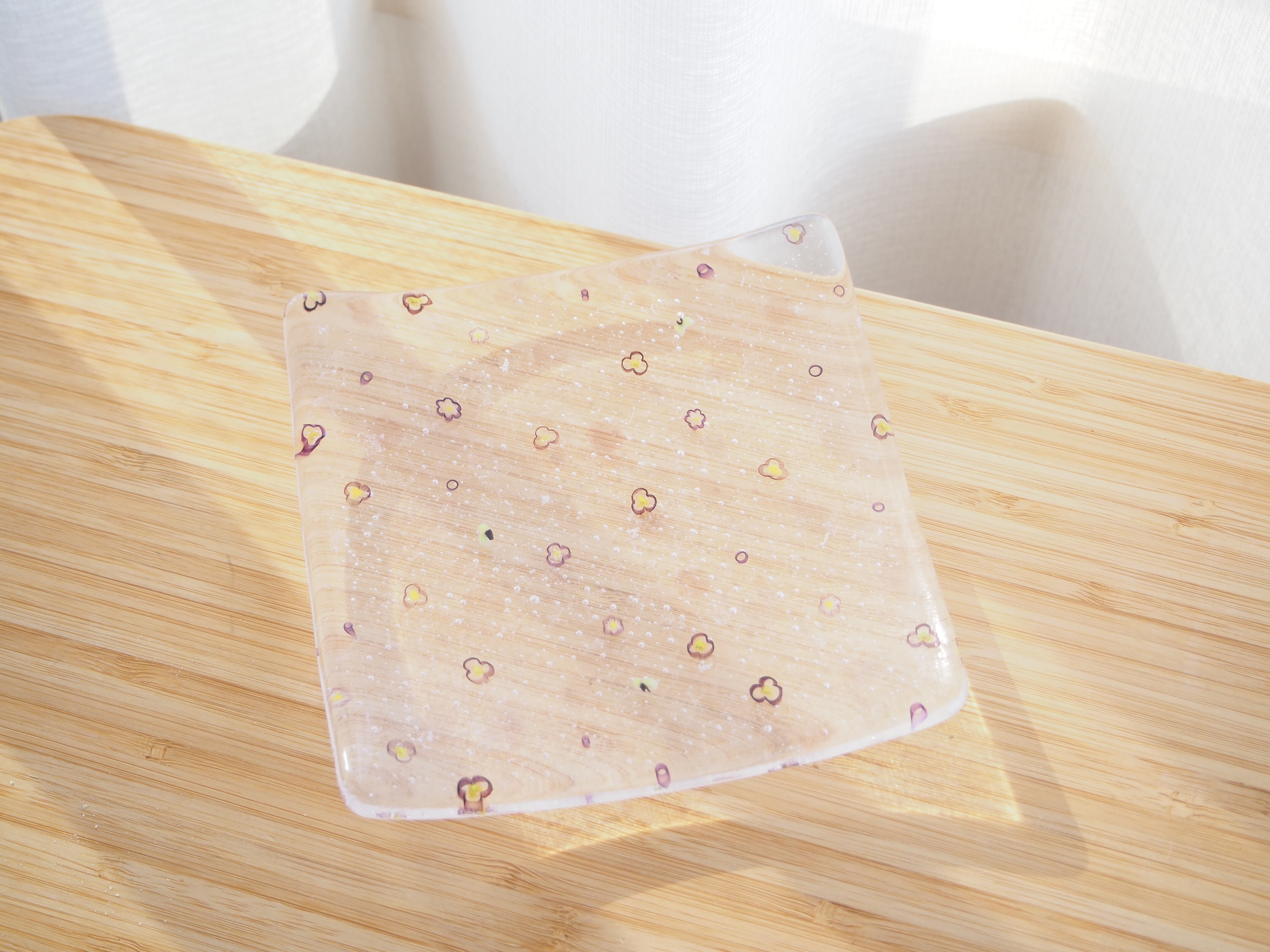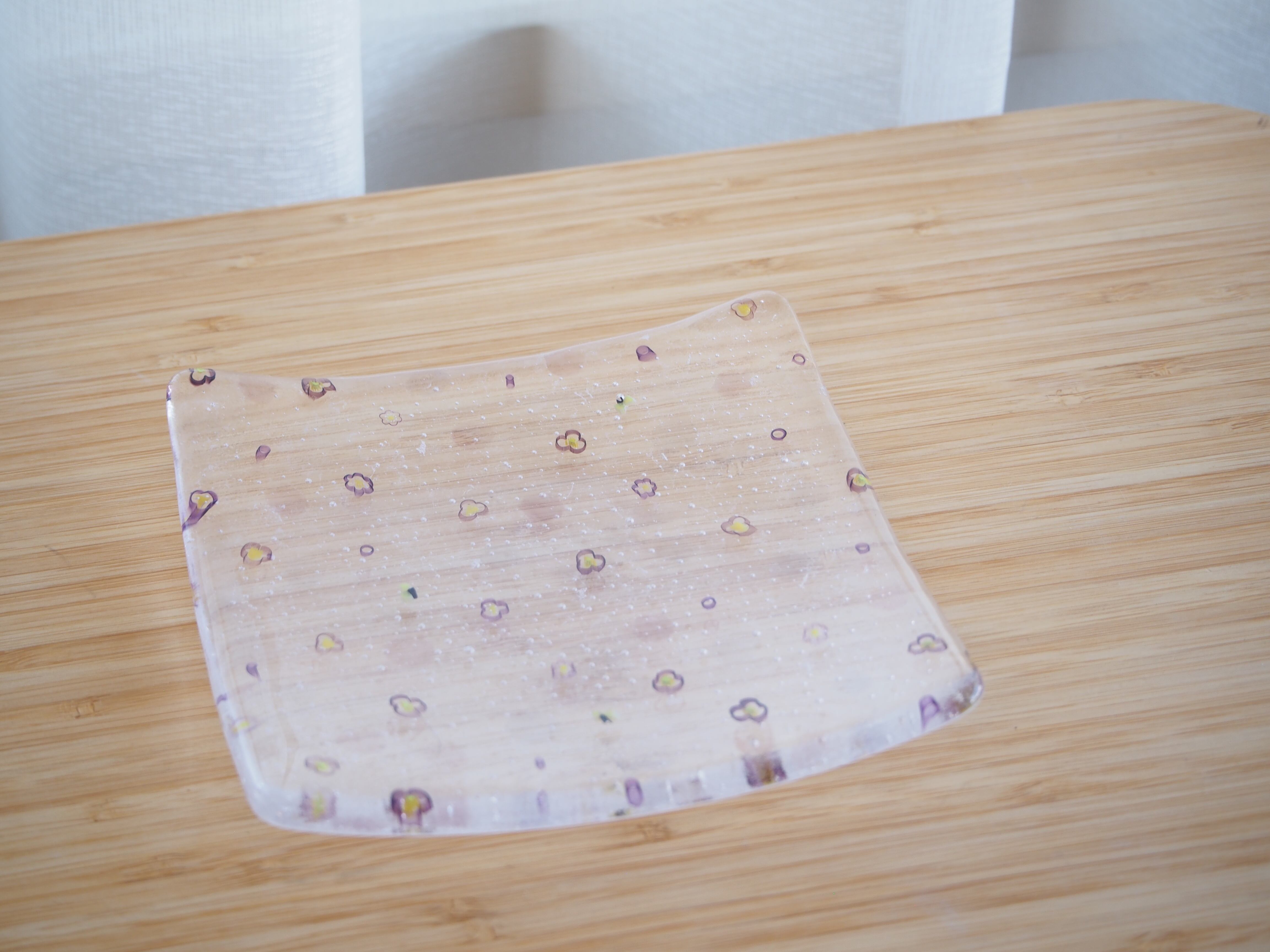 花の模様が入ったガラスのお皿です。模様はベネチアンテクニックのひとつであるmurrine技法で作られています。