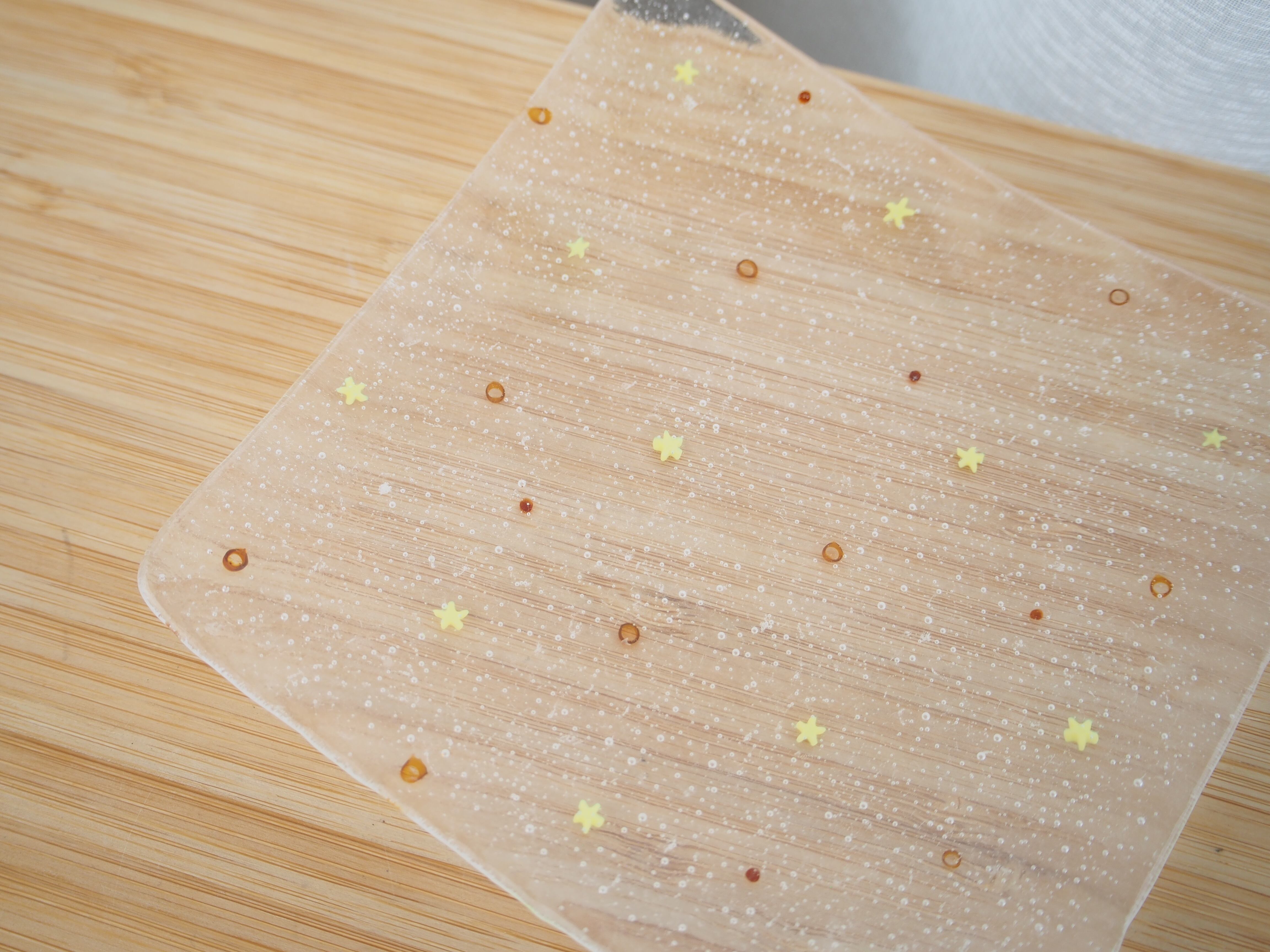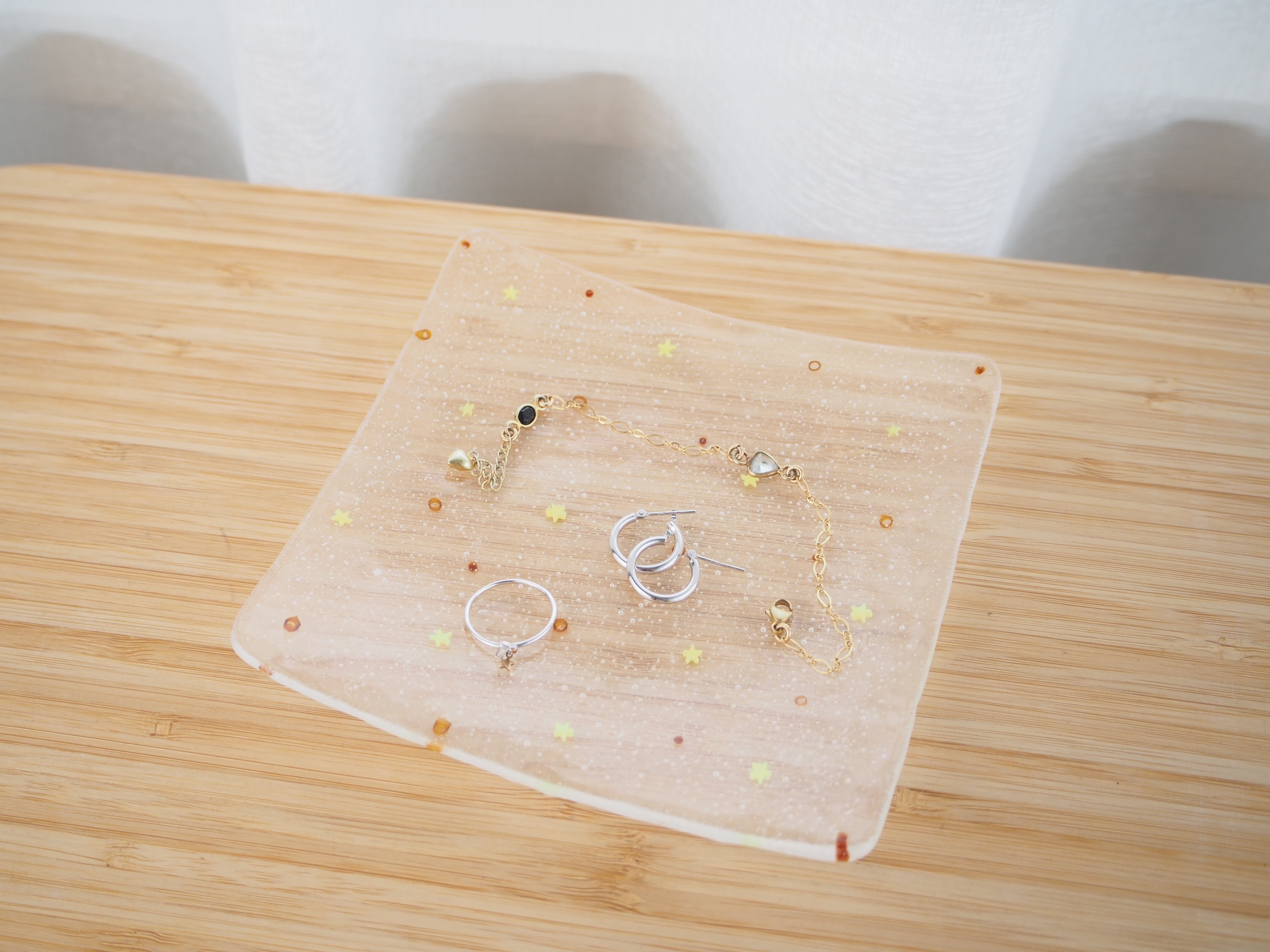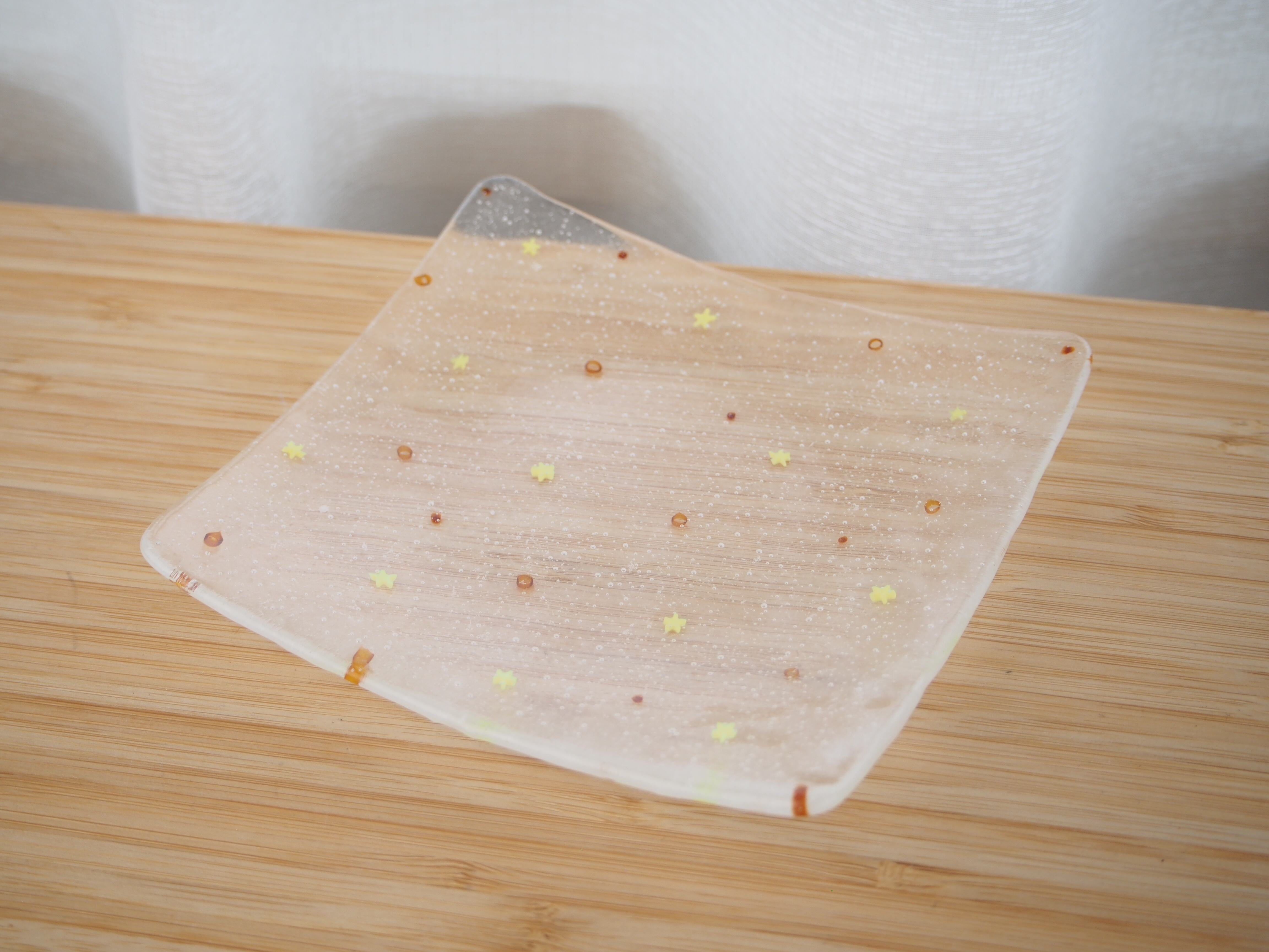 ソーダ水のようにシュワシュワした感じの小さな気泡とその中に浮かぶ星のデザインは、食卓を一気に華やかに演出してくれます。サイズは約11cm×11cmとなっており、チーズなどのおつまみや和菓子・洋菓子、フルーツをのせるのにちょうど良いサイズです。
