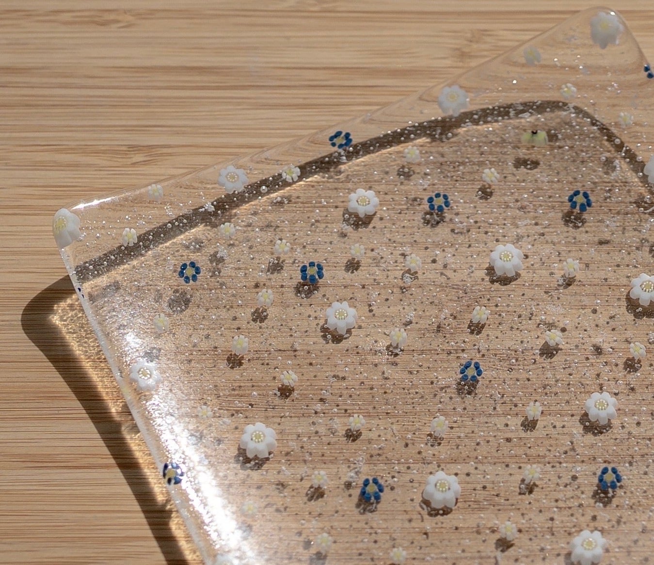 白い花と黄色い蝶々の模様が入ったガラスのお皿です。模様はベネチアンテクニックのひとつであるmurrine技法で作られています。